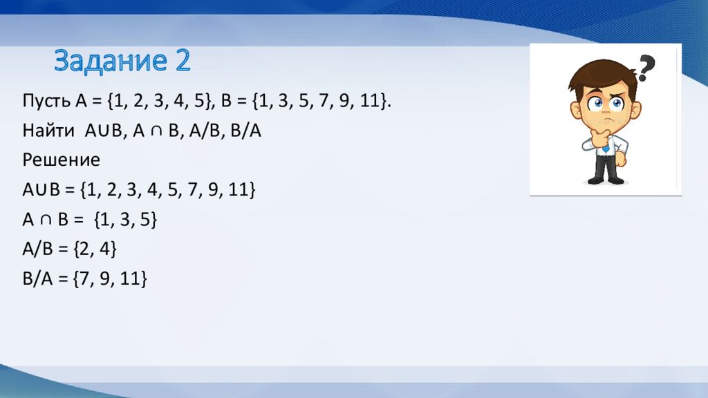 Пусть A = {1, 2, 3, 4, 5}, B = {1, 3, 5, 7, 9, 11}. Найти A∪ B, A ∩ B, A / B, B /А Решение A∪B = {1, 2, 3, 4, 5, 7, 9, 11 } A ∩ B = {1, 3, 5} A / B = { 2, 4 } B /А = {7, 9, 11}