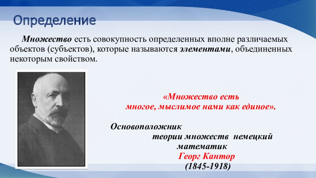 Множество есть совокупность определенных вполне различаемых объектов (субъектов), которые называются элементами, объединенных некоторым свойством. «Множество есть многое, мыслимое нами как единое». Основоположник теории множеств немецкий математик Георг Кантор (1845-1918)
