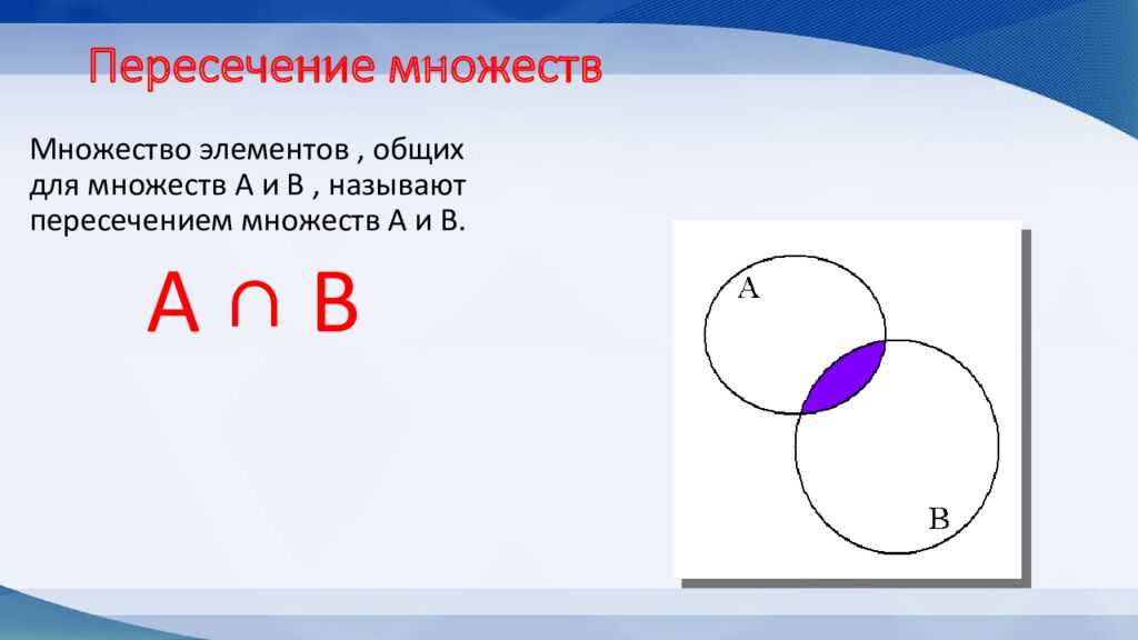 Множество элементов, общих для множеств А и В, называют пересечением множеств А и В. А ∩ В