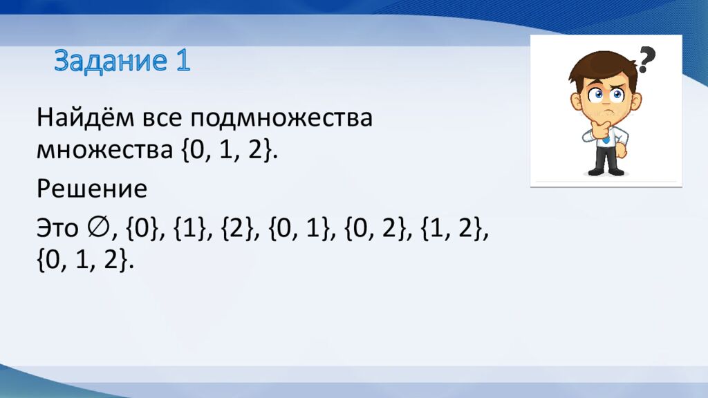 Найдём все подмножества множества {0, 1, 2}. Решение Это ∅, {0}, {1}, {2}, {0, 1}, {0, 2}, {1, 2 }, {0, 1, 2}.