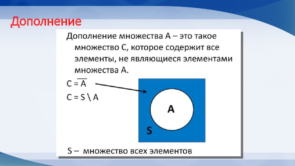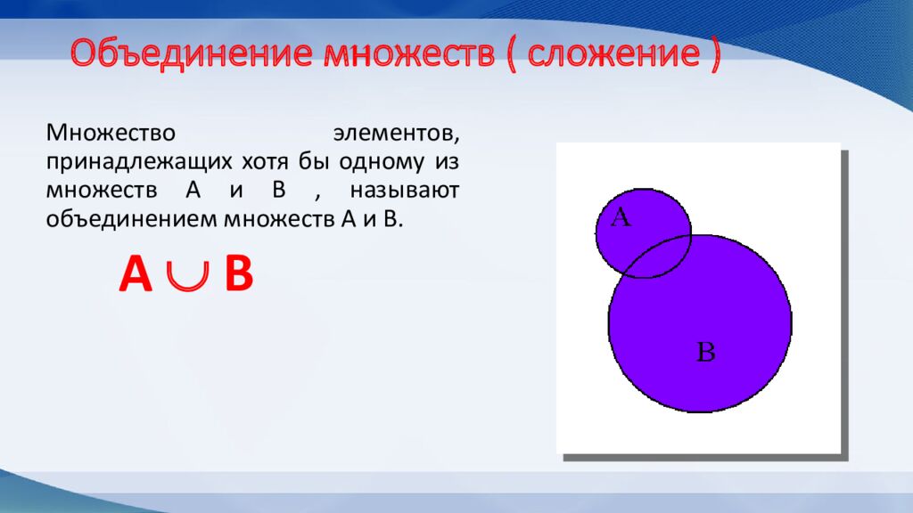 Множество элементов, принадлежащих хотя бы одному из множеств А и В, называют объединением множеств А и В. А В