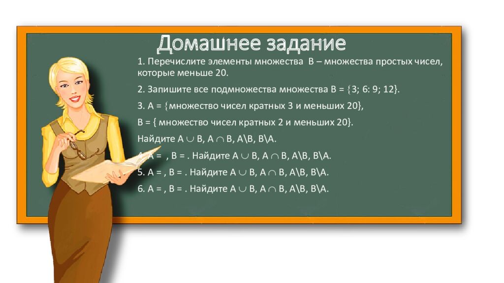 Последний слайд презентации: Множество, операции над множествами. Диаграммы Эйлера – Венна: Домашнее задание