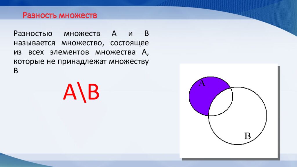 Разностью множеств А и В называется множество, состоящее из всех элементов множества А, которые не принадлежат множеству В А\В