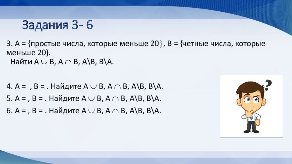 3. А = {простые числа, которые меньше 20 , В = {четные числа, которые меньше 20 }. Найти А В, А В, А\В, В\А. 4. А =, В =. Найдите А В, А В, А\В, В\А. 5. А =, В =. Найдите А В, А В, А\В, В\А. 6. А =, В =. Найдите А В, А В, А\В, В\А.