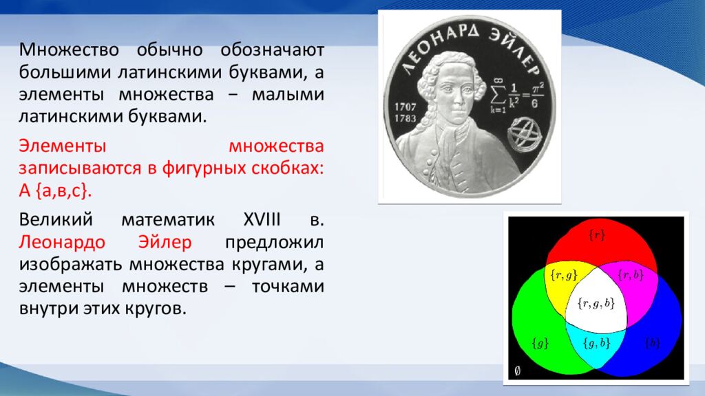 Множество обычно обозначают большими латинскими буквами, а элементы множества − малыми латинскими буквами. Элементы множества записываются в фигурных скобках: А {а,в,с }. Великий математик XVIII в. Леонардо Эйлер предложил изображать множества кругами, а элементы множеств – точками внутри этих кругов.