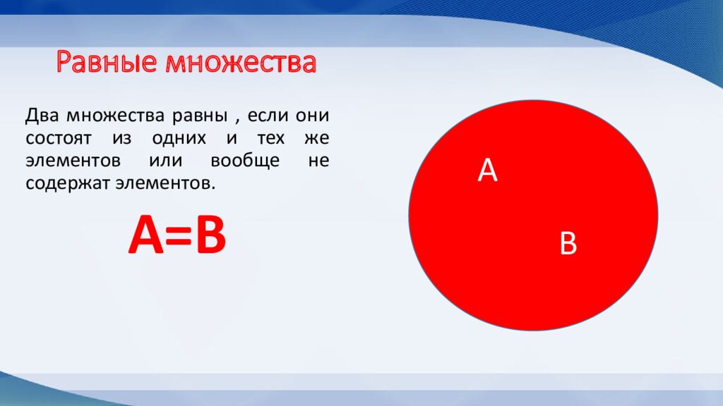 Два множества равны, если они состоят из одних и тех же элементов или вообще не содержат элементов. А=В А В