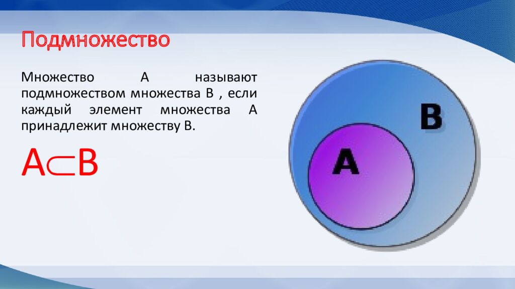 Множество А называют подмножеством множества В, если каждый элемент множества А принадлежит множеству В. А В