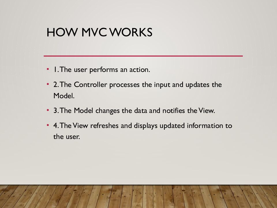1. The user performs an action. 2. The Controller processes the input and updates the Model. 3. The Model changes the data and notifies the View. 4. The View refreshes and displays updated information to the user.