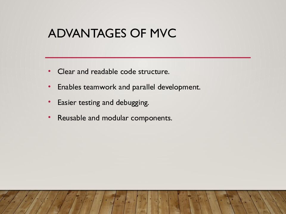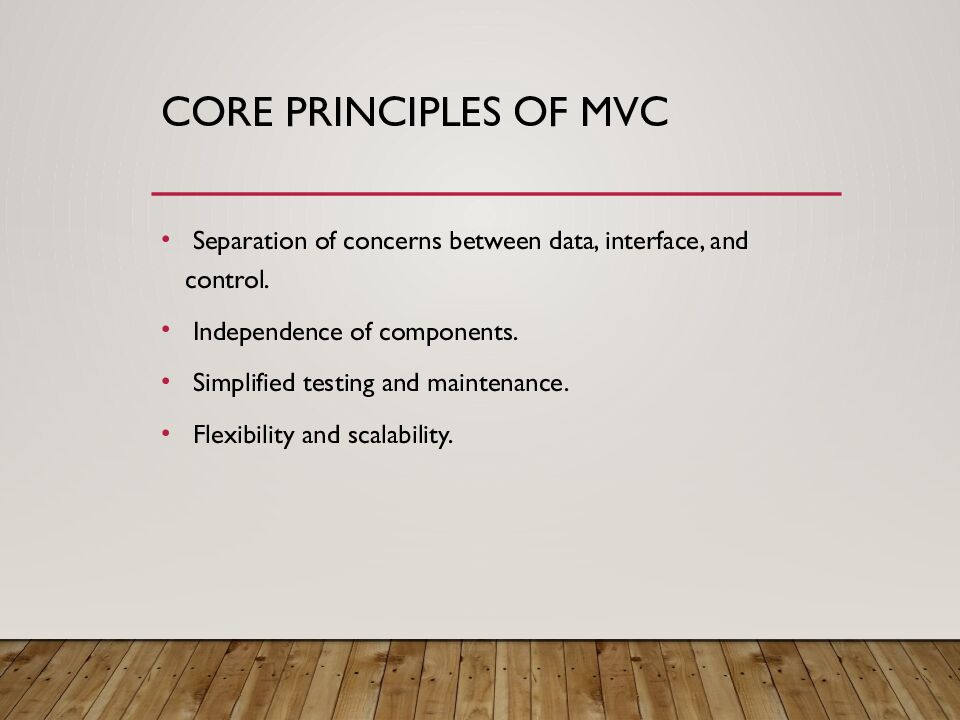 Separation of concerns between data, interface, and control. Independence of components. Simplified testing and maintenance. Flexibility and scalability.