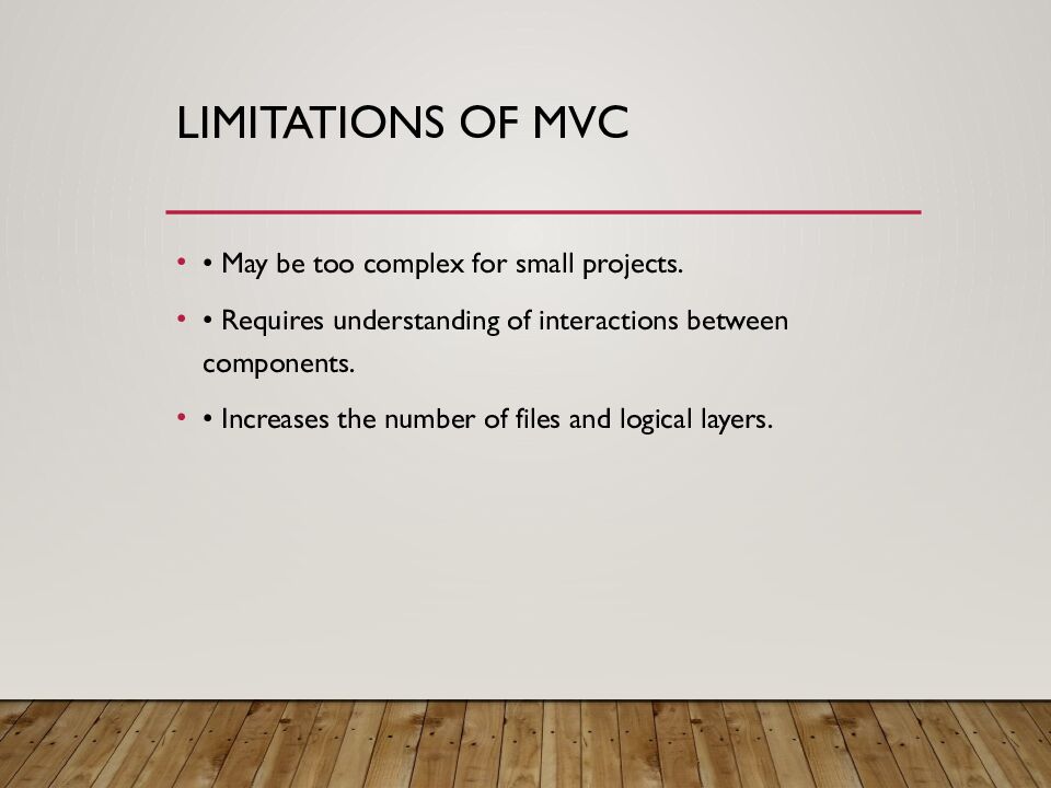 • May be too complex for small projects. • Requires understanding of interactions between components. • Increases the number of files and logical layers.