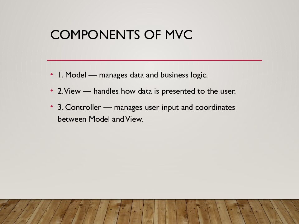 1. Model — manages data and business logic. 2. View — handles how data is presented to the user. 3. Controller — manages user input and coordinates between Model and View.