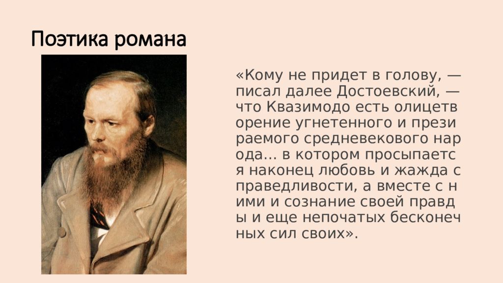 «Кому не придет в голову, — писал далее Достоевский, — что Квазимодо есть олицетворение угнетенного и презираемого средневекового народа... в котором просыпается наконец любовь и жажда справедливости, а вместе с ними и сознание своей правды и еще непочатых бесконечных сил своих».