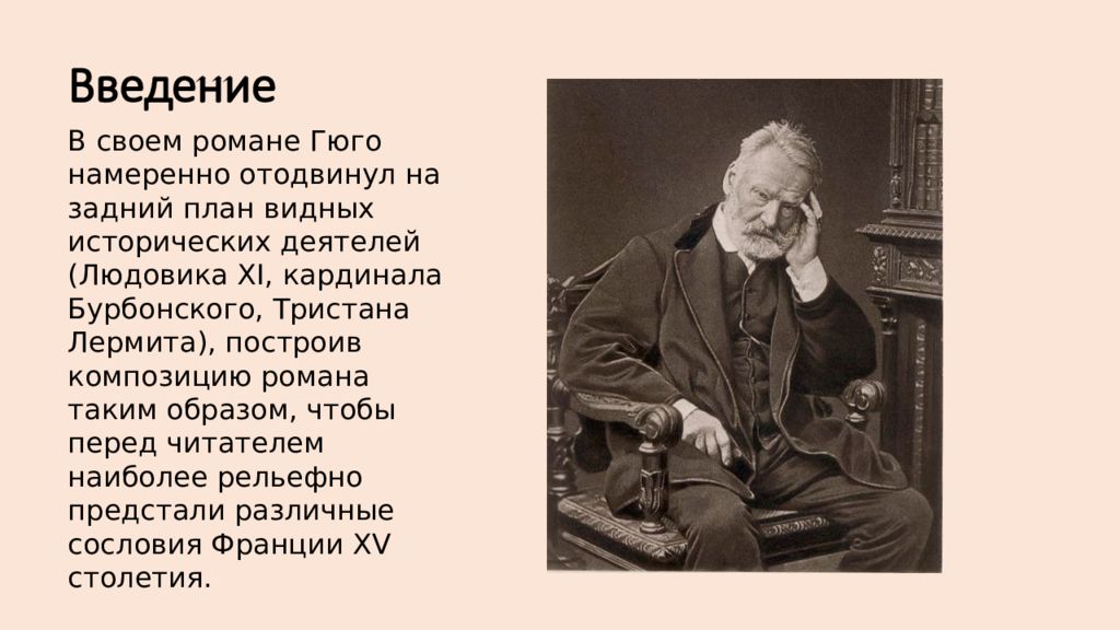 В своем романе Гюго намеренно отодвинул на задний план видных исторических деятелей (Людовика XI, кардинала Бурбонского, Тристана Лермита), построив композицию романа таким образом, чтобы перед читателем наиболее рельефно предстали различные сословия Франции XV столетия.