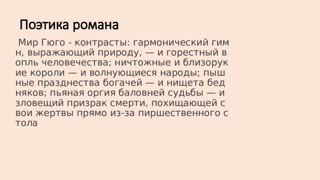 Мир Гюго - контрасты: гармонический гимн, выражающий природу, — и горестный вопль человечества; ничтожные и близорукие короли — и волнующиеся народы; пышные празднества богачей — и нищета бедняков; пьяная оргия баловней судьбы — и зловещий призрак смерти, похищающей свои жертвы прямо из-за пиршественного стола
