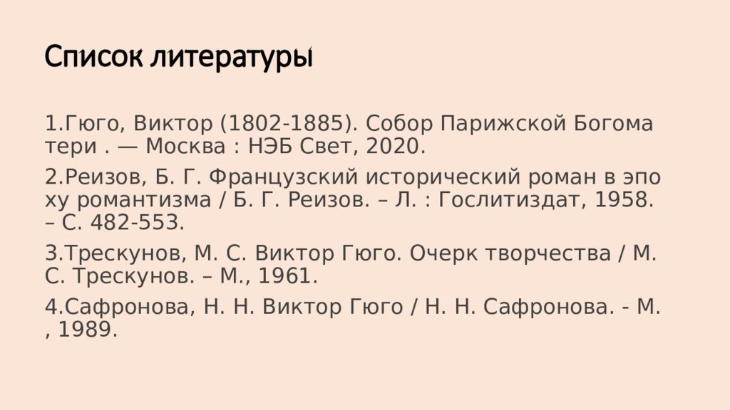 Последний слайд презентации: Модификации жанра романа («Собор Парижской Богоматери»): Список литературы