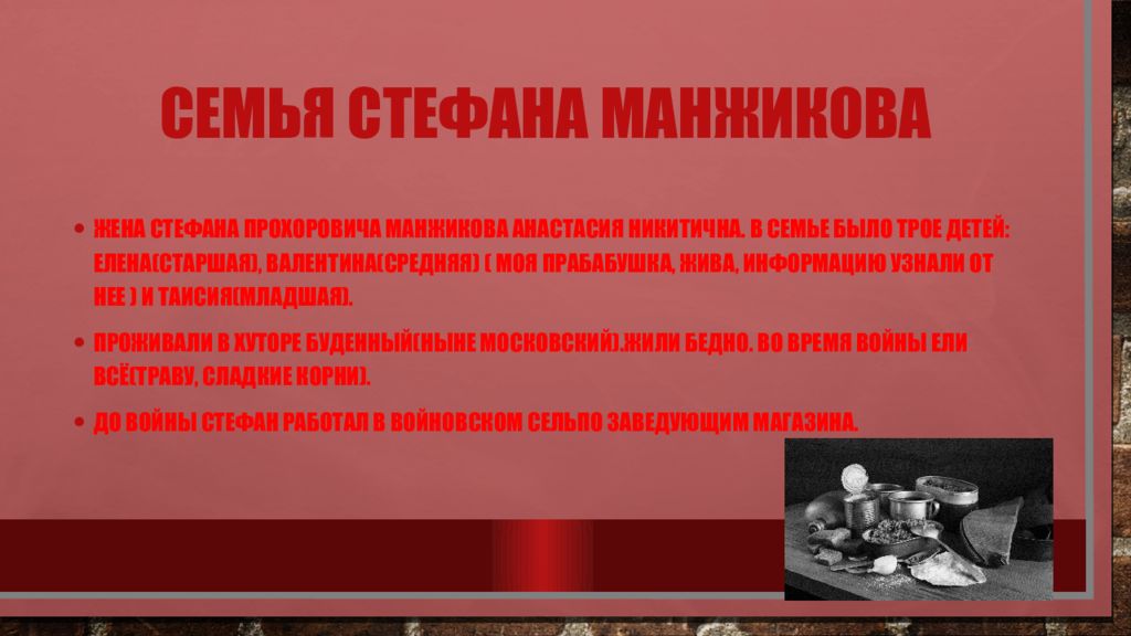 Жена Стефана Прохоровича Манжикова Анастасия Никитична. В семье было трое детей: Елена(старшая), Валентина(средняя ) ( моя прабабушка, жива, информацию узнали от нее ) и Таисия(младшая ). Проживали в хуторе Буденный(ныне Московский).Жили бедно. Во время войны ели всё(траву, сладкие корни). До войны Стефан работал в Войновском сельпо заведующим магазина.