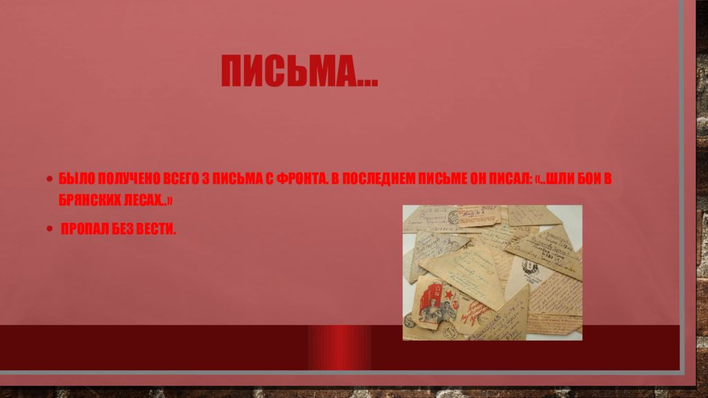 Было получено всего 3 письма с фронта. В последнем письме он писал: «..шли бои в Брянских лесах..» Пропал без вести.