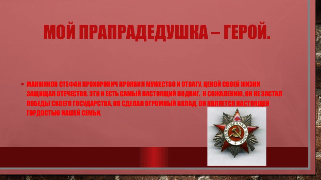 Манжиков стефан прохорович проявил мужество и отвагу, ценой своей жизни защищал отечество. Это и есть самый настоящий подвиг. К сожалению, он не застал победы своего государства, но сделал огромный вклад. Он является настоящей гордостью нашей семьи.