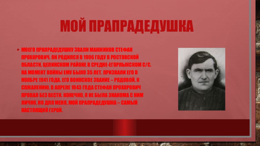 Моего прапрадедушку звали Манжиков стефан прохорович. Он родился в 1906 году в ростовской области, целинском районе в средне- егорлыкском с /c. На момент войны ему было 35 лет. Призвали его в ноябре 1941 года. Его воинское звание – рядовой. К сожалению, в апреле 1943 года стефан прохорович пропал без вести. Конечно, я не была знакома с ним лично, но для меня, мой прапрадедушка – самый настоящий герой.