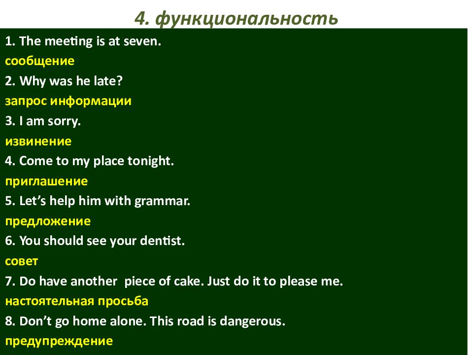 1. The meeting is at seven. сообщение 2. Why was he late? запрос информации 3. I am sorry. извинение 4. Come to my place tonight. приглашение 5. Let’s help him with grammar. предложение 6. You should see your dentist. с овет 7. Do have another piece of cake. Just do it to please me. настоятельная просьба 8. Don’t go home alone. This road is dangerous. предупреждение