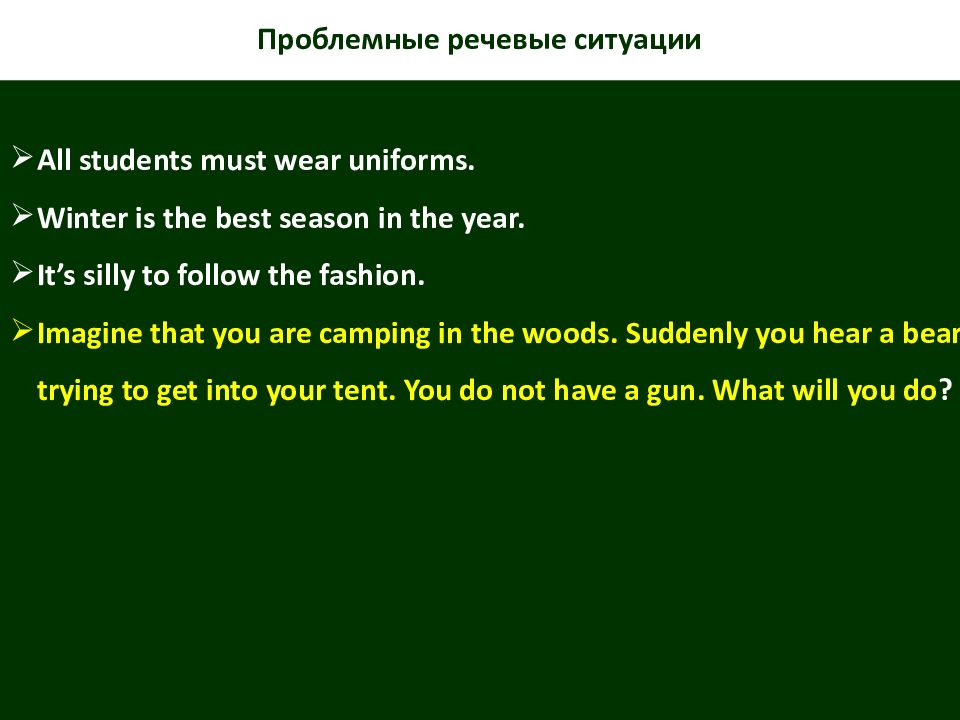 All students must wear uniforms. Winter is the best season in the year. It’s silly to follow the fashion. Imagine that you are camping in the woods. Suddenly you hear a bear trying to get into your tent. You do not have a gun. What will you do ?