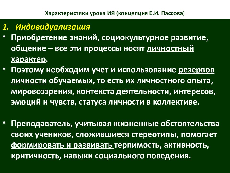Индивидуализация Приобретение знаний, социокультурное развитие, общение – все эти процессы носят личностный характер. Поэтому необходим учет и использование резервов личности обучаемых, то есть их личностного опыта, мировоззрения, контекста деятельности, интересов, эмоций и чувств, статуса личности в коллективе. Преподаватель, учитывая жизненные обстоятельства своих учеников, сложившиеся стереотипы, помогает формировать и развивать терпимость, активность, критичность, навыки социального поведения.