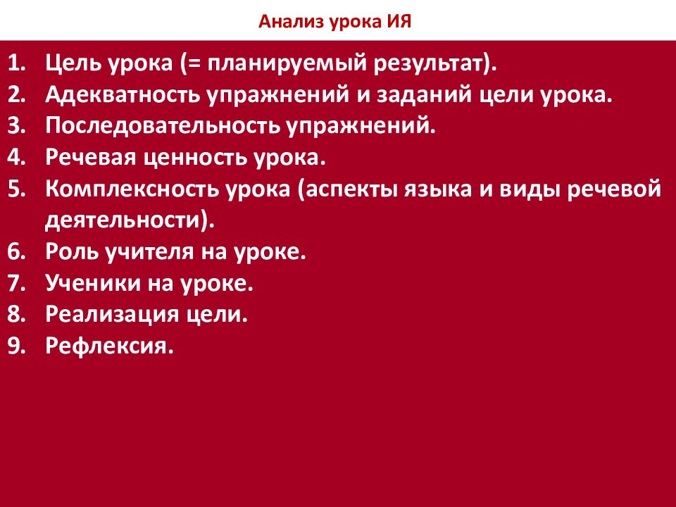 Цель урока (= планируемый результат). Адекватность упражнений и заданий цели урока. Последовательность упражнений. Речевая ценность урока. Комплексность урока (аспекты языка и виды речевой деятельности). Роль учителя на уроке. Ученики на уроке. Реализация цели. Рефлексия.