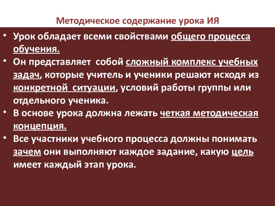 Урок обладает всеми свойствами общего процесса обучения. Он представляет собой сложный комплекс учебных задач, которые учитель и ученики решают исходя из конкретной ситуации, условий работы группы или отдельного ученика. В основе урока должна лежать четкая методическая концепция. Все участники учебного процесса должны понимать зачем они выполняют каждое задание, какую цель имеет каждый этап урока.