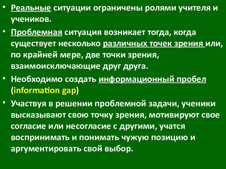Реальные ситуации ограничены ролями учителя и учеников. Проблемная ситуация возникает тогда, когда существует несколько различных точек зрения или, по крайней мере, две точки зрения, взаимоисключающие друг друга. Необходимо создать информационный пробел ( information gap ) Участвуя в решении проблемной задачи, ученики высказывают свою точку зрения, мотивируют свое согласие или несогласие с другими, учатся воспринимать и понимать чужую позицию и аргументировать свой выбор.