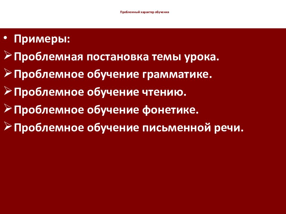 Примеры: Проблемная постановка темы урока. Проблемное обучение грамматике. Проблемное обучение чтению. Проблемное обучение фонетике. Проблемное обучение письменной речи. П роблемный характер обучения