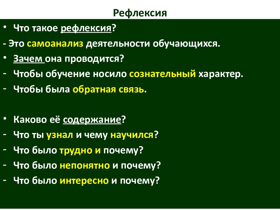 Что такое рефлексия ? - Это самоанализ деятельности обучающихся. Зачем она проводится? Чтобы обучение носило сознательный характер. Чтобы была обратная связь. Каково её содержание ? Что ты узнал и чему научился ? Что было трудно и почему? Что было непонятно и почему? Что было интересно и почему?