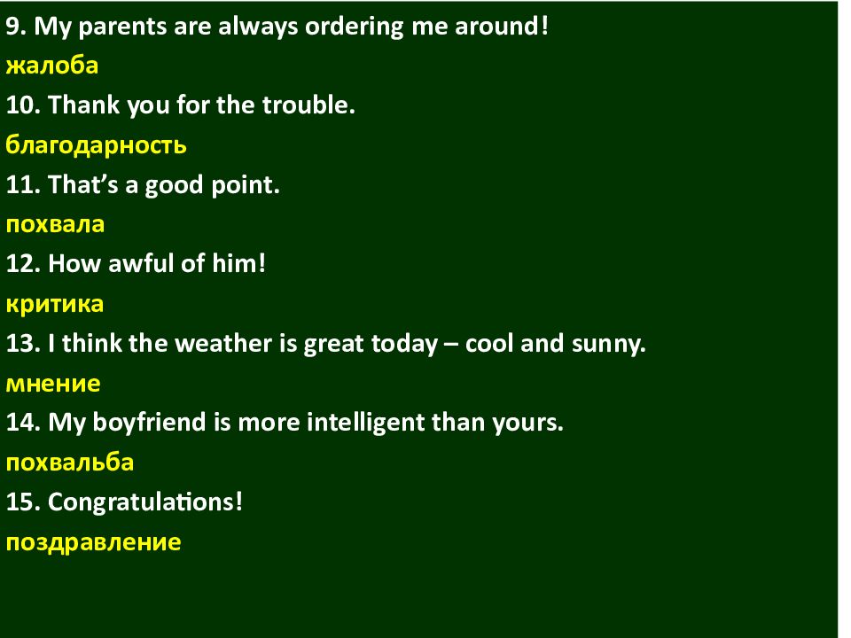 9. My parents are always ordering me around! жалоба 10. Thank you for the trouble. благодарность 11. That’s a good point. похвала 12. How awful of him! критика 13. I think the weather is great today – cool and sunny. мнение 14. My boyfriend is more intelligent than yours. похвальба 15. Congratulations ! поздравление