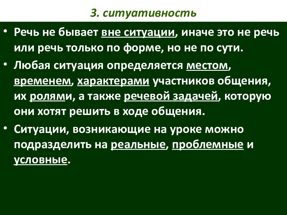 Речь не бывает вне ситуации, иначе это не речь или речь только по форме, но не по сути. Любая ситуация определяется местом, временем, характерами участников общения, их ролям и, а также речевой задачей, которую они хотят решить в ходе общения. Ситуации, возникающие на уроке можно подразделить на реальные, проблемные и условные.