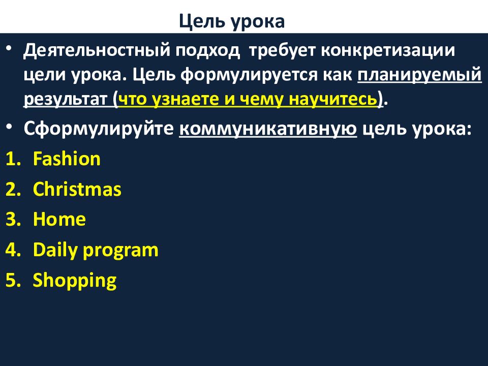 Деятельностный подход требует конкретизации цели урока. Цель формулируется как планируемый результат ( что узнаете и чему научитесь ). Сформулируйте коммуникативную цель урока: Fashion Christmas Home Daily program Shopping