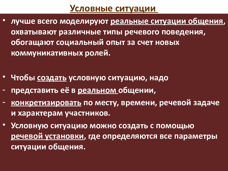лучше всего моделируют реальные ситуации общения, охватывают различные типы речевого поведения, обогащают социальный опыт за счет новых коммуникативных ролей. Чтобы создать условную ситуацию, надо представить её в реальном общении, к онкретизировать по месту, времени, речевой задаче и характерам участников. Условную ситуацию можно создать с помощью речевой установки, где определяются все параметры ситуации общения.