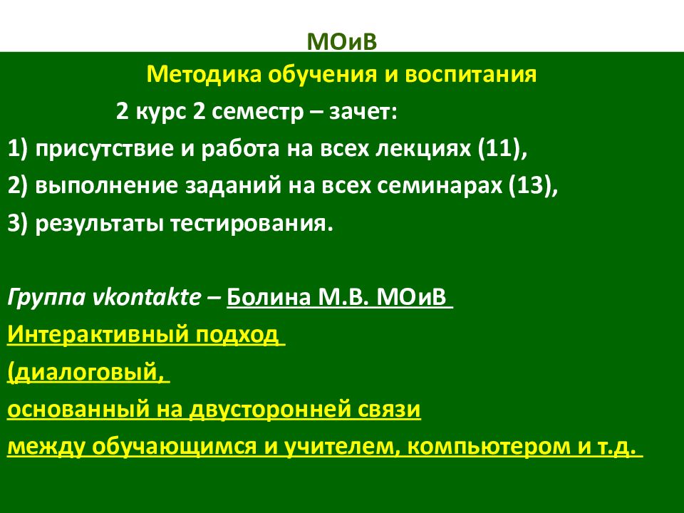 Методика обучения и воспитания 2 курс 2 семестр – зачет: 1) п рисутствие и работа на всех лекциях (11), 2) выполнение заданий на всех семинарах (13), 3) р езультаты тестирования. Группа vkontakte – Болина М.В. МОиВ Интерактивный подход (диалоговый, основанный на двусторонней связи м ежду обучающимся и учителем, компьютером и т.д.