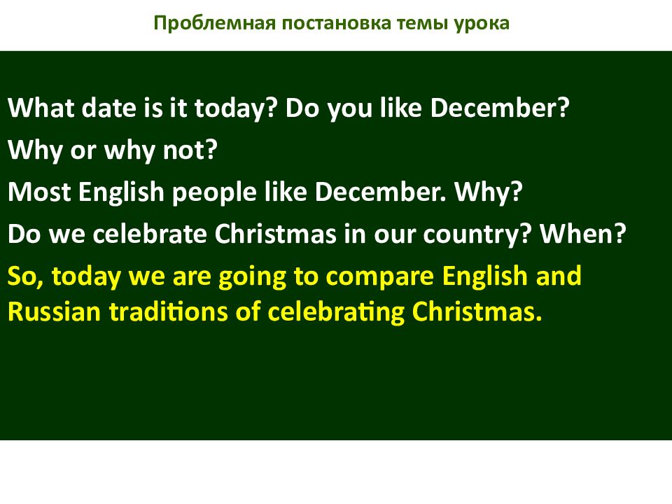 What date is it today? Do you like December? Why or why not? Most English people like December. Why? Do we celebrate Christmas in our country? When? So, today we are going to compare English and Russian traditions of celebrating Christmas.