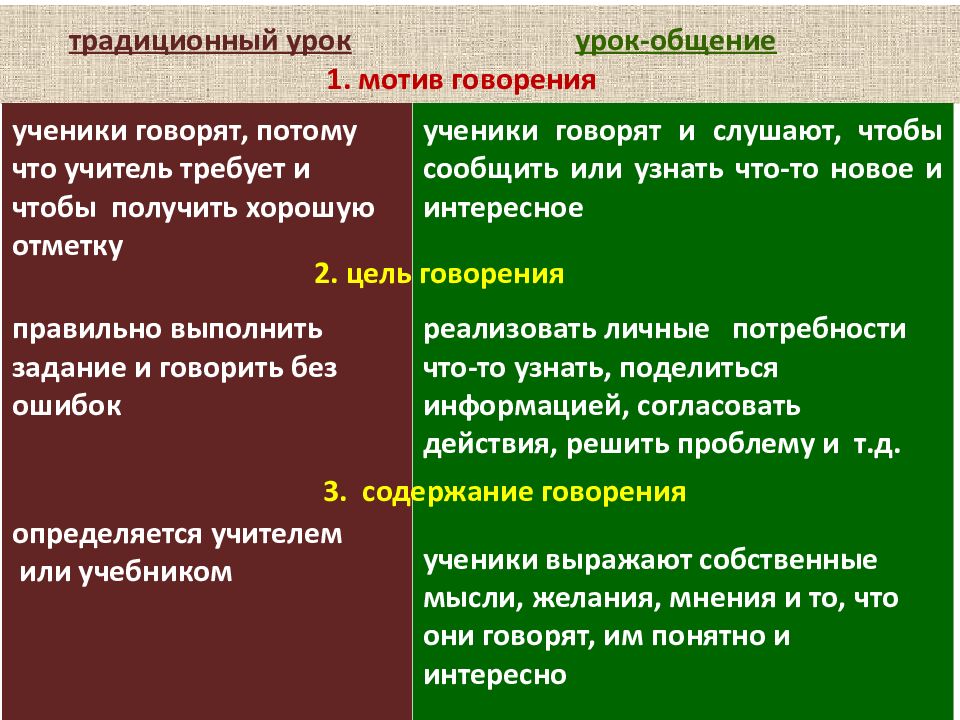 ученики говорят, потому что учитель требует и чтобы получить хорошую отметку правильно выполнить задание и говорить без ошибок определяется учителем или учебником ученики говорят и слушают, чтобы сообщить или узнать что-то новое и интересное реализовать личные потребности что-то узнать, поделиться информацией, согласовать действия, решить проблему и т.д. ученики выражают собственные мысли, желания, мнения и то, что они говорят, им понятно и интересно 2. цель говорения 3. содержание говорения