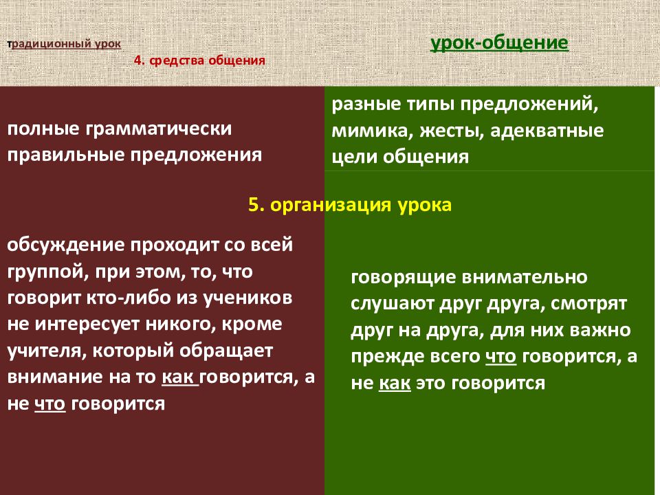 полные грамматически правильные предложения обсуждение проходит со всей группой, при этом, то, что говорит кто-либо из учеников не интересует никого, кроме учителя, который обращает внимание на то как говорится, а не что говорится урок-общение разные типы предложений, мимика, жесты, адекватные цели общения говорящие внимательно слушают друг друга, смотрят друг на друга, для них важно прежде всего что говорится, а не как это говорится 5. организация урока