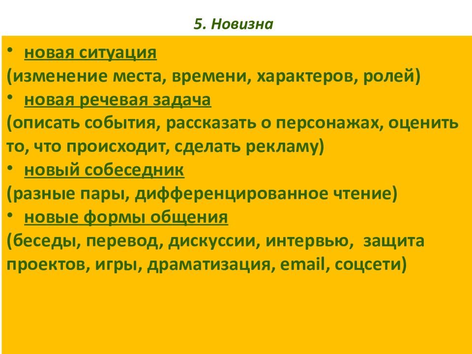н овая ситуация (изменение места, времени, характеров, ролей) н овая речевая задача (описать события, рассказать о персонажах, оценить то, что происходит, сделать рекламу) н овый собеседник (разные пары, дифференцированное чтение) н овые формы общения (беседы, перевод, дискуссии, и нтервью, защита проектов, игры, драматизация, email, соцсети )