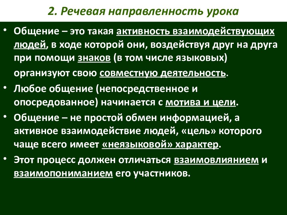 Общение – это такая активность взаимодействующих людей, в ходе которой они, воздействуя друг на друга при помощи знаков (в том числе языковых) организуют свою совместную деятельность. Любое общение (непосредственное и опосредованное) начинается с мотива и цели. Общение – не простой обмен информацией, а активное взаимодействие людей, «цель» которого чаще всего имеет «неязыковой» характер. Этот процесс должен отличаться взаимовлиянием и взаимопониманием его участников.