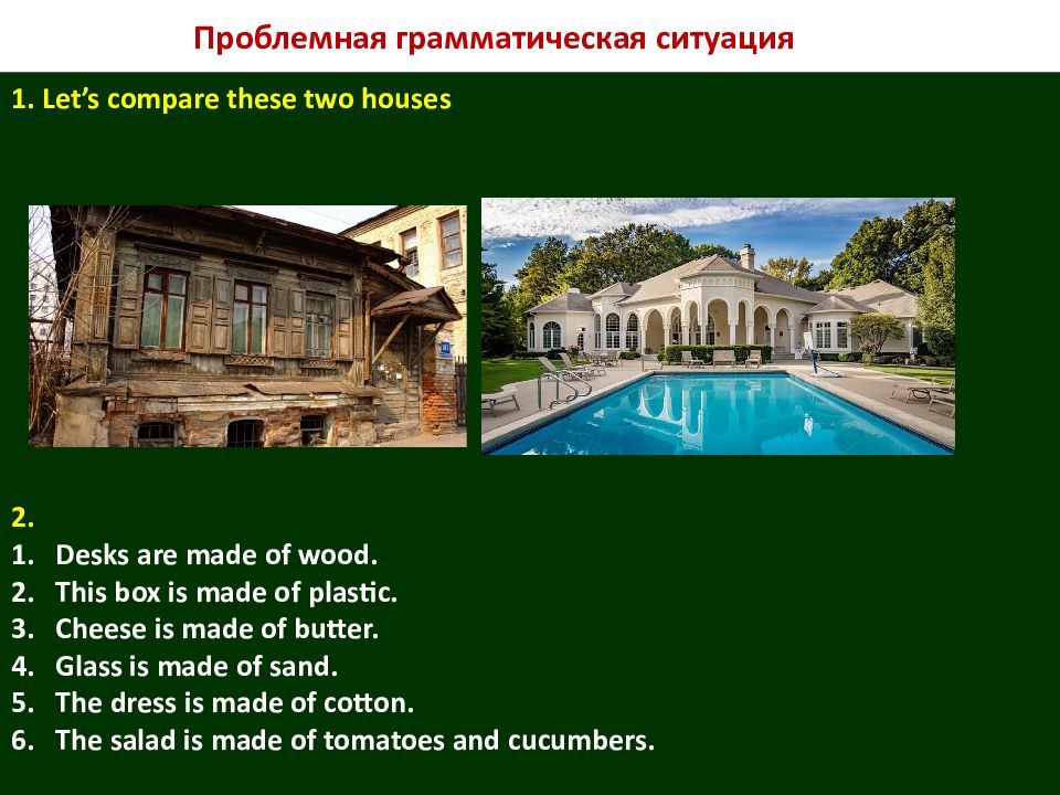 1. Let’s compare these two houses 2. Desks are made of wood. This box is made of plastic. Cheese is made of butter. Glass is made of sand. The dress is made of cotton. The salad is made of tomatoes and cucumbers.