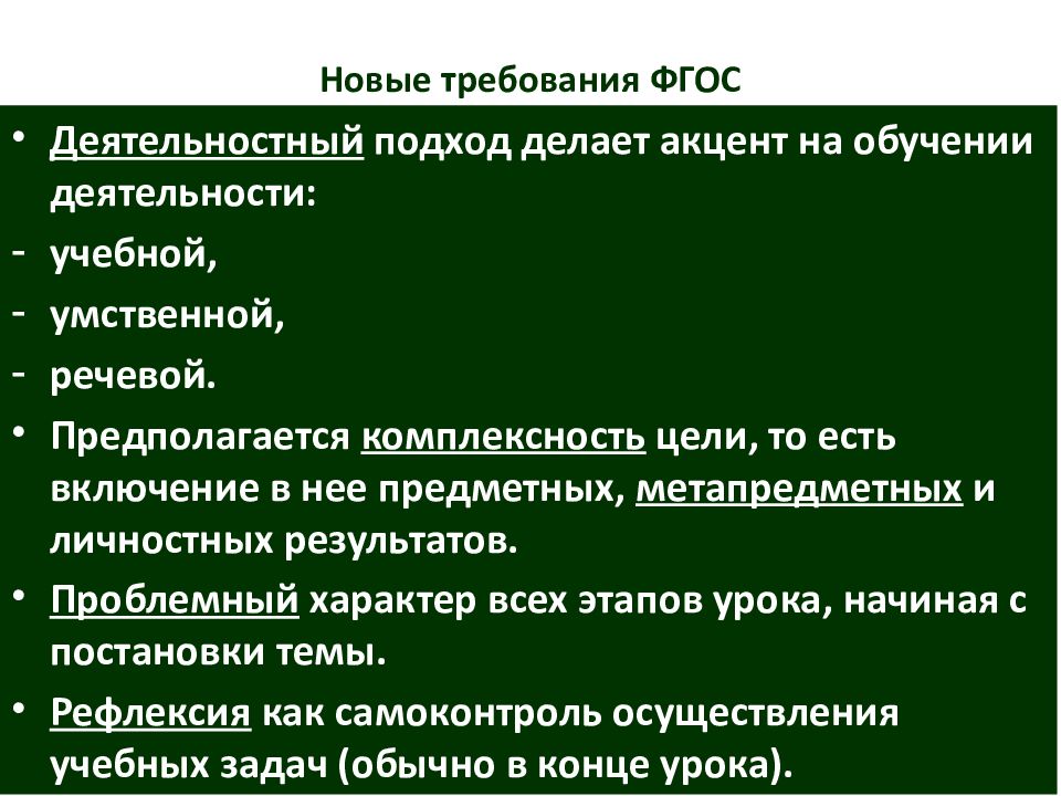 Деятельностный подход делает акцент на обучении деятельности: учебной, умственной, р ечевой. Предполагается комплексность цели, то есть включение в нее предметных, метапредметных и личностных результатов. Проблемный характер всех этапов урока, начиная с постановки темы. Рефлексия как самоконтроль осуществления учебных задач (обычно в конце урока).