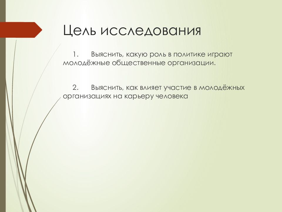1. Выяснить, какую роль в политике играют молодёжные общественные организации. 2. Выяснить, как влияет участие в молодёжных организациях на карьеру человека
