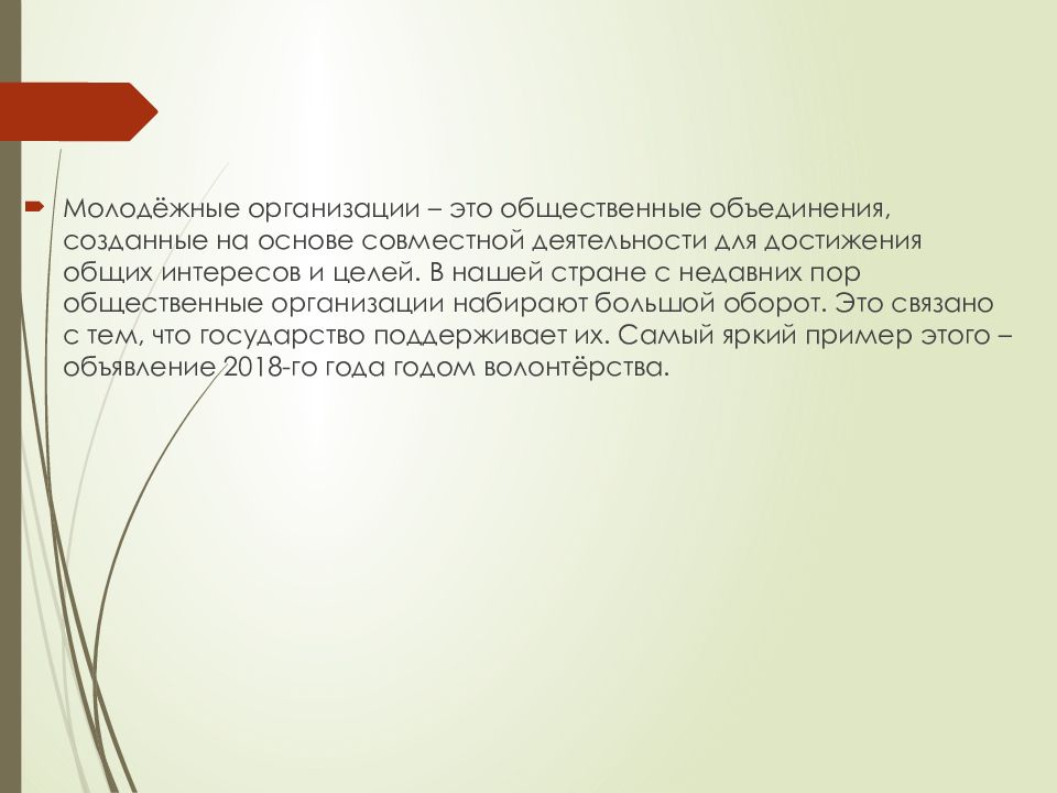 Молодёжные организации – это общественные объединения, созданные на основе совместной деятельности для достижения общих интересов и целей. В нашей стране с недавних пор общественные организации набирают большой оборот. Это связано с тем, что государство поддерживает их. Самый яркий пример этого – объявление 2018-го года годом волонтёрства.