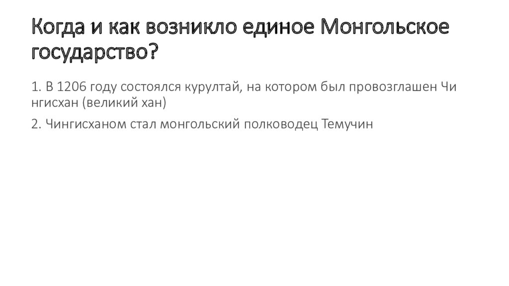 1. В 1206 году состоялся курултай, на котором был провозглашен Чингисхан ( великий хан ) 2. Чингисханом стал монгольский полководец Темучин