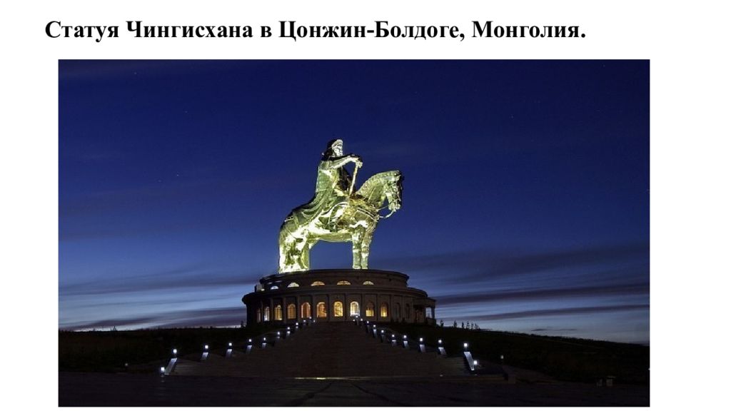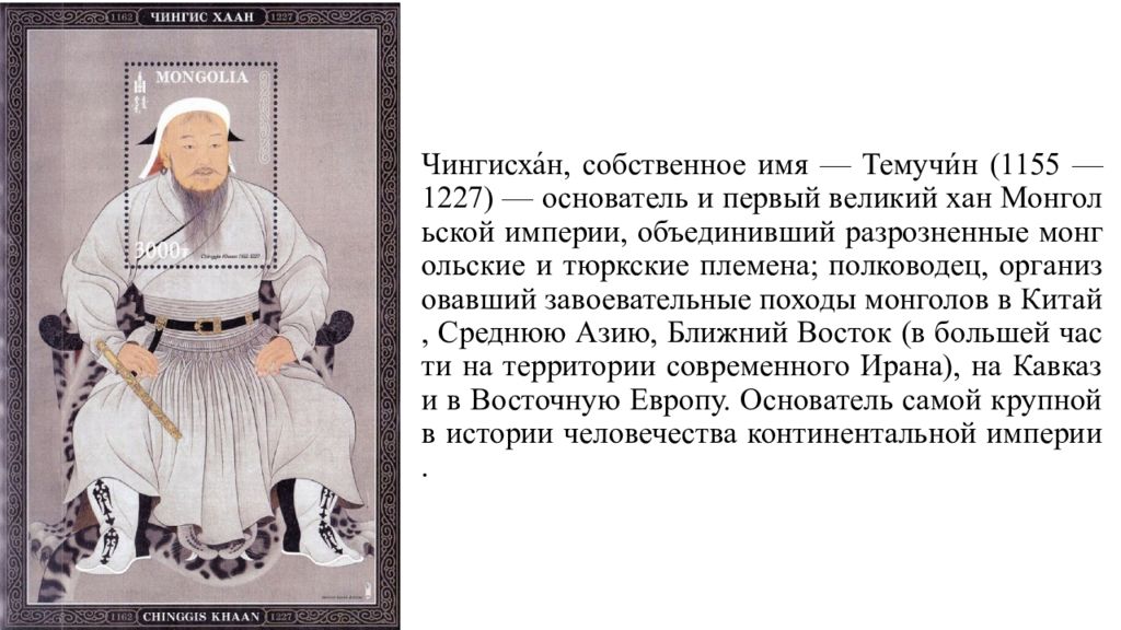Слайд 7: Чингисха́н, собственное имя — Темучи́н (1155 — 1227) — основатель и первый великий хан Монгольской империи, объединивший разрозненные монгольские и тюркские племена ; полководец, организовавший завоевательные походы монголов в Китай, Среднюю Азию, Ближний Восток ( в большей части на территории современного Ирана ), на Кавказ и в Восточную Европу. Основатель самой крупной в истории человечества континентальной империи
