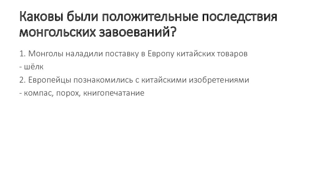 Слайд 51: Каковы были положительные последствия монгольских завоеваний ?