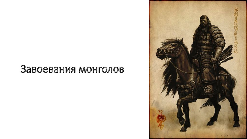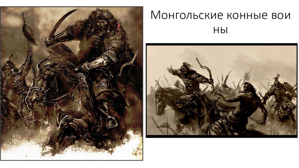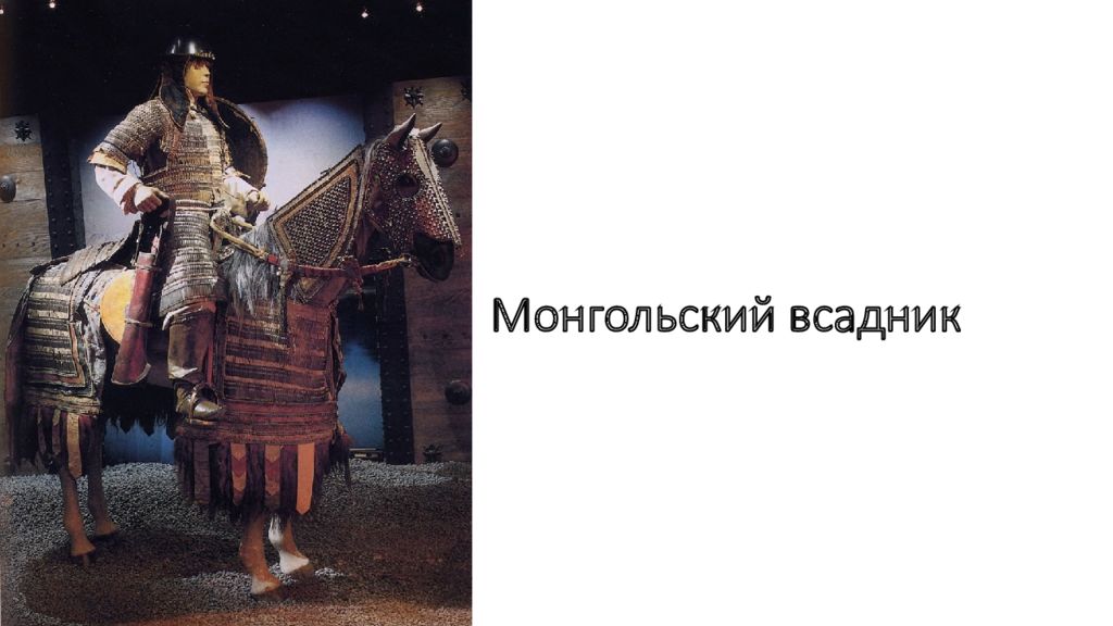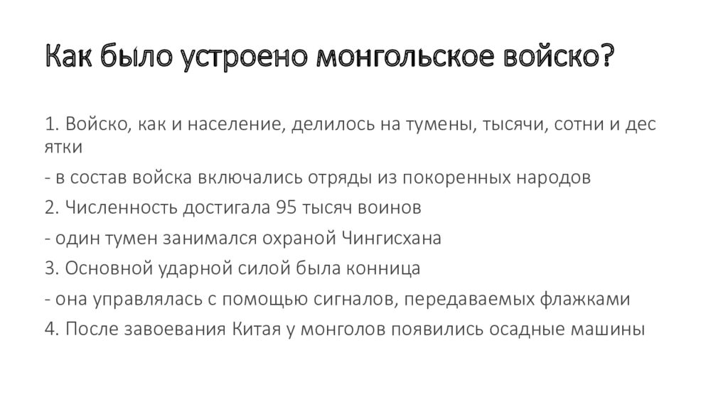 1. Войско, как и население, делилось на тумены, тысячи, сотни и десятки - в состав войска включались отряды из покоренных народов 2. Численность достигала 95 тысяч воинов - один тумен занимался охраной Чингисхана 3. Основной ударной силой была конница - она управлялась с помощью сигналов, передаваемых флажками 4. После завоевания Китая у монголов появились осадные машины