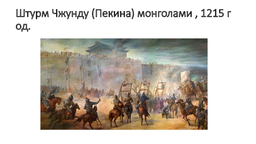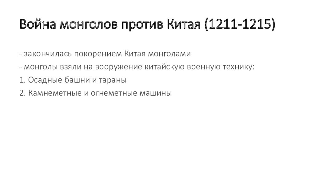 - закончилась покорением Китая монголами - монголы взяли на вооружение китайскую военную технику : 1. Осадные башни и тараны 2. Камнеметные и огнеметные машины